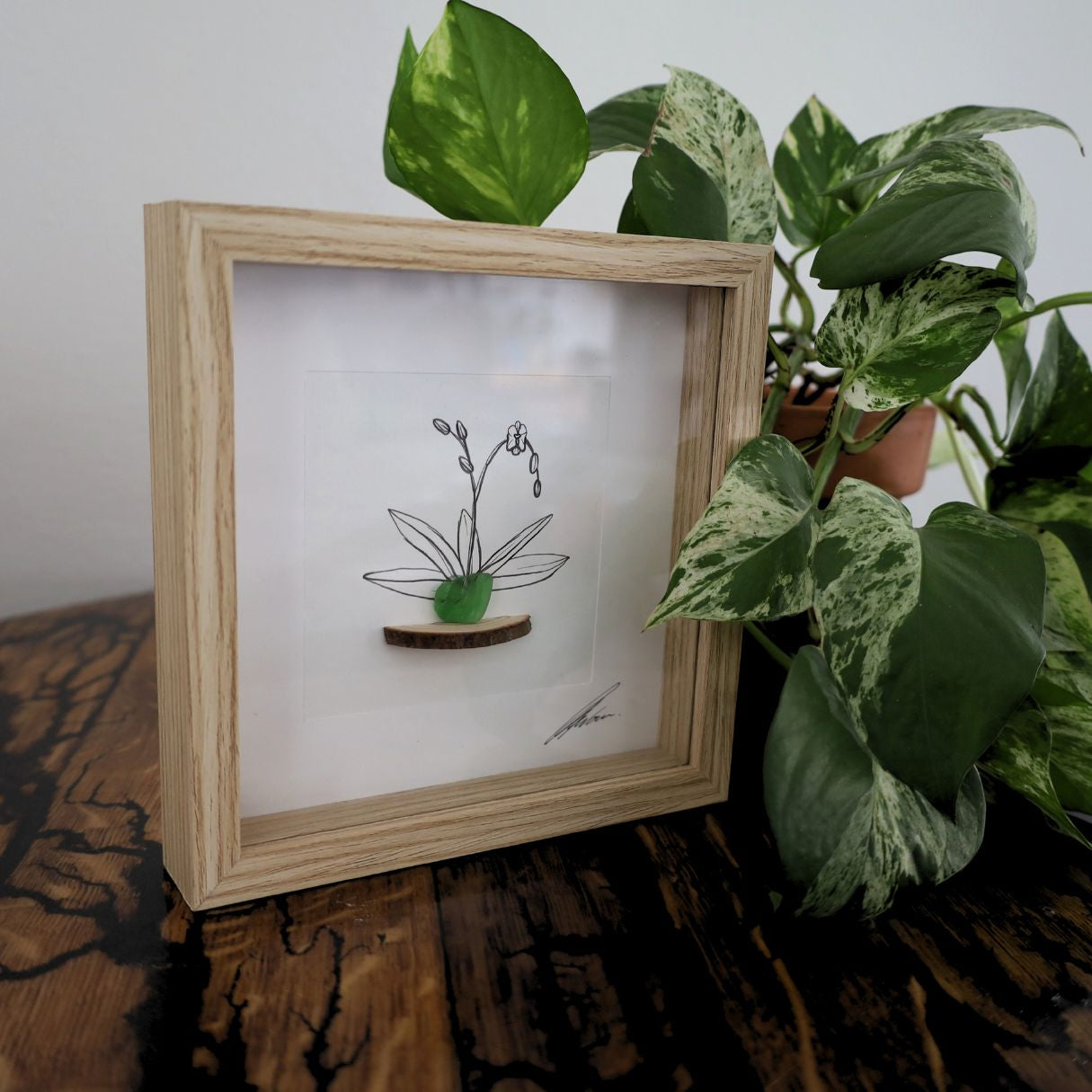 Eden Bloom’s Botanical Artworks are more than illustrations, they’re tactile celebrations of nature, combining hand-drawn pen work with found natural materials (Natures Treasures). Each piece begins with a detailed botanical sketch, then layered with elements like shells, sea glass, driftwood, or stone to create textured forms such as pots, ground, or foliage. The result is a one of a kind artwork, inviting both visual and sensory connection.